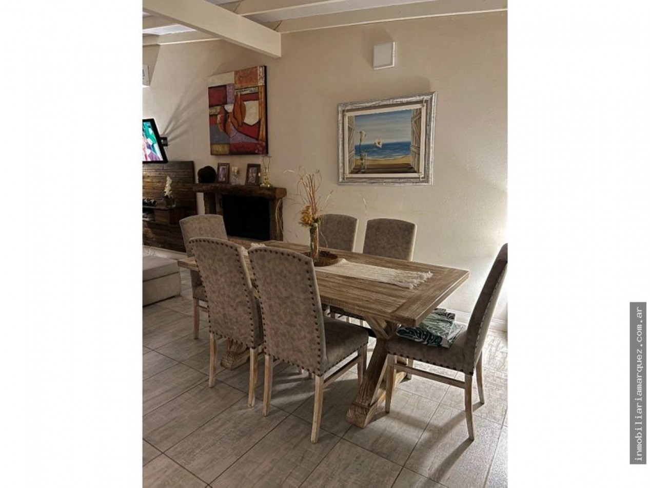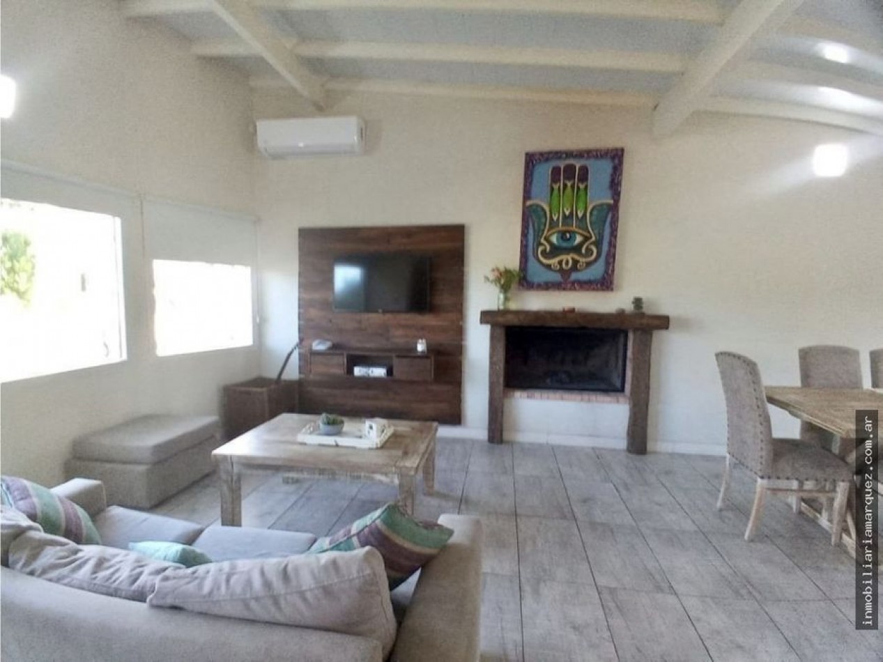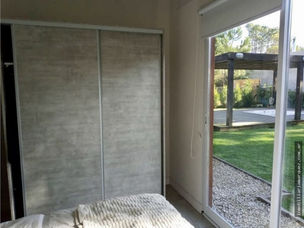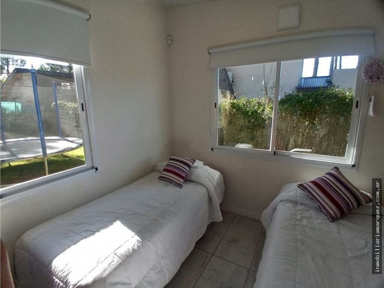 Casa el barrio Nayades sobre un lote de 690 mts con una construcción de 100 mt2 con el sistema Steel Framing ( construcción en seco ) Aberturas de aluminio con DVH Pisos de porchelanato Cocina a inducción - horno eléctrico - Heladera inverter Cocina comedor integrada Hogar a leña - aire acondicionado 1 dormitorios con baño en suite 2 dormitorios 2 baños completos Sector lavadero completo Parque en la parte trasera con orientación norte con cerco vivo y alambre Parrilla Riego Automatizado Deck con jacuzzi Cámara de seguridad Alarma perimetral Amplio sector de ingreso arbolado Cargos no incluidos en el valor locativo: - Comisión inmobiliaria: 10% - Cargos fijos adicionales por administración, gestión y limpieza final del inmueble $30.000.- - Carga DirecTV Prepago por cuenta del inquilino si correspondiere - En todos los casos se requiere al Locatario un depósito en garantía en efectivo del 30% del valor del alquiler que debe ser entregado al momento de la firma del Contrato de Locación, el mismo se reintegra al egreso una vez constatado el funcionamiento y buen estado de la propiedad. - Cargos fijos por consumos de luz, agua corriente, se encuentran incluidos en el precio del alquiler, salvo que se indique lo contrario. - El alquiler de la propiedad no incluye el servicio de ropa blanca, ni servicio de limpieza diaria. - Todos estos cargos se abonarán al momento de la firma del Contrato de Locación. Prohibiciones: - No se aceptan grupos de jóvenes. - No se aceptan mascotas.